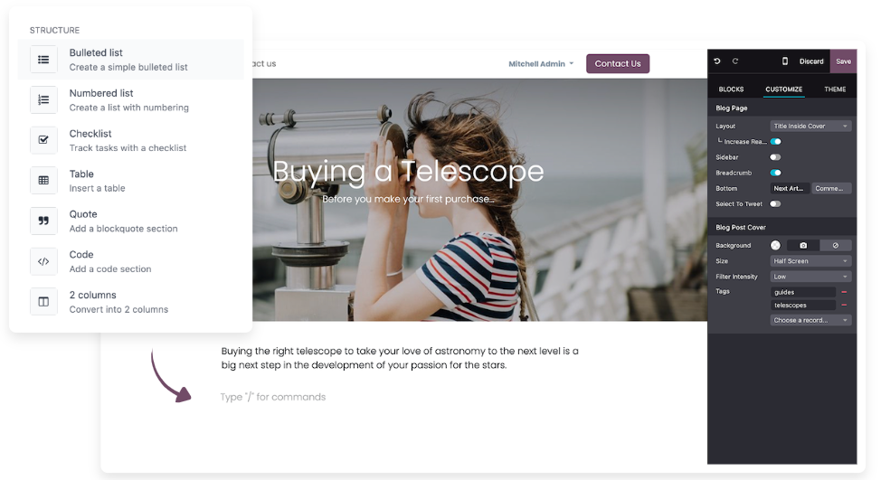 Odoo ofrece un editor intuitivo podrás modificar formatos, añadir multimedia, reorganizar tu estructura y dar vida a publicaciones bien diseñadas sin complicaciones técnicas.