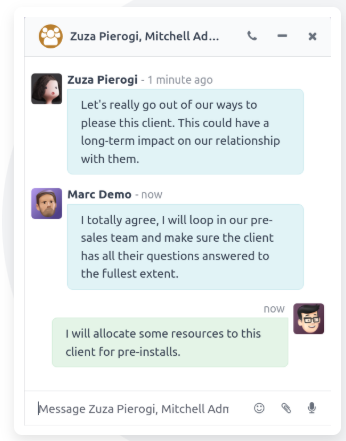 Odoo Conversaciones integra la comunicación dentro del mismo sistema donde se gestionan las operaciones permitiendo mantener el contexto, reducir fricciones y mejorar la eficiencia. De esta forma, los equipos pueden colaborar sin salir de su entorno de trabajo, asegurando que la información relevante esté siempre disponible.