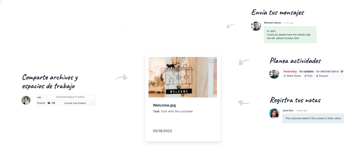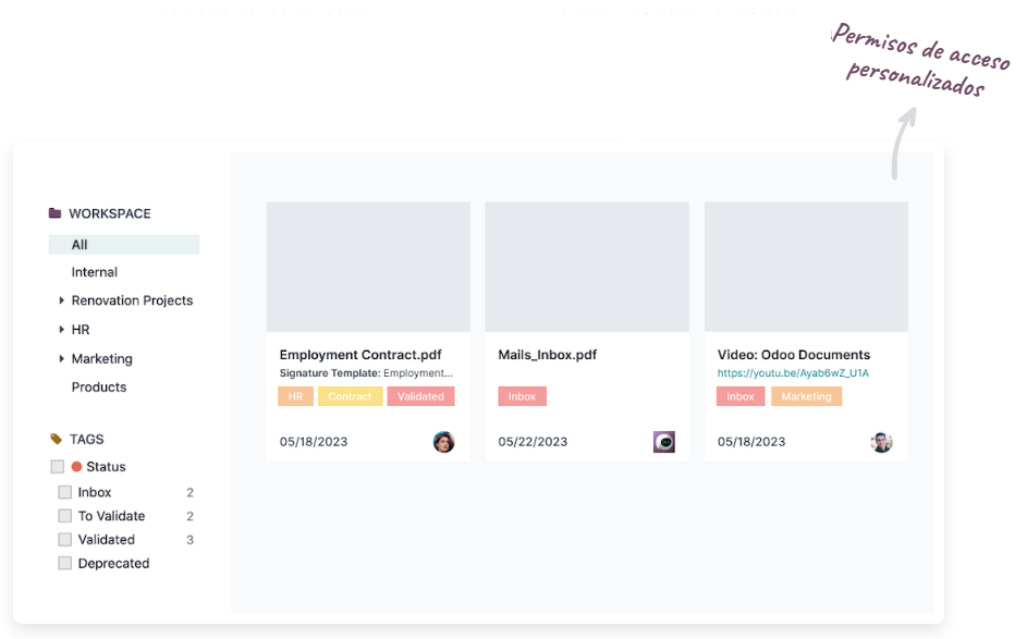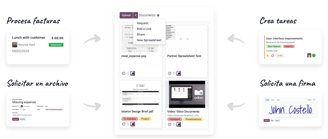 Con la aplicación Documentos de Odoo olvídate de imprimir y escanear: la aplicación permite solicitar y obtener firmas electrónicas de forma segura y en minutos. Integrar firmas digitales en tus flujos reduce tiempos de ciclo en contratos, ofertas y aprobaciones, y garantiza trazabilidad jurídica y operativa.
