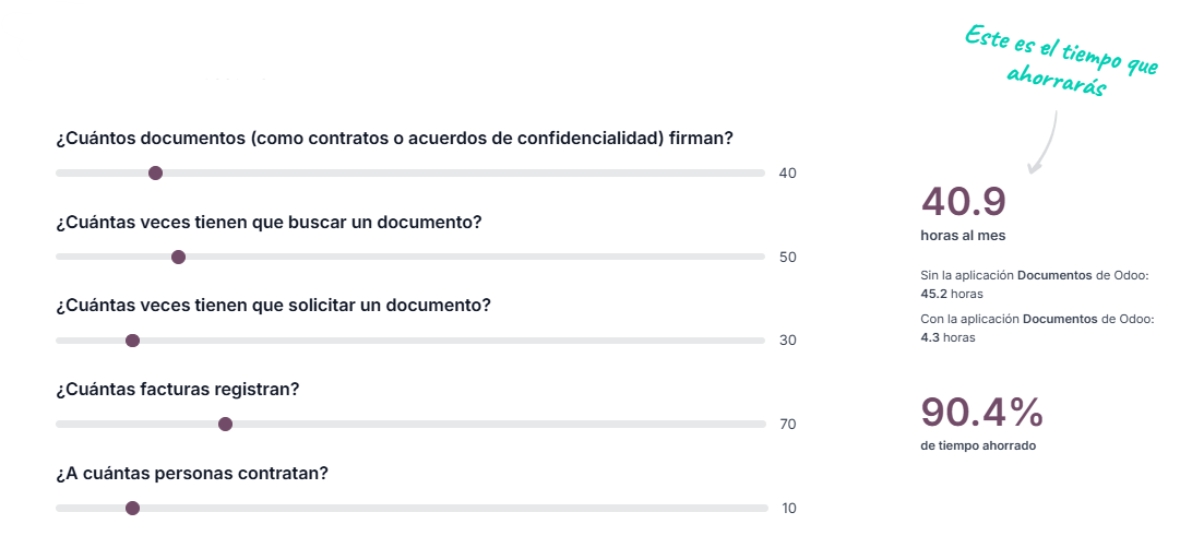 Documentos incluye una calculadora interactiva que estima cuánto tiempo ahorras automatizando tareas habituales (firmas, búsquedas, solicitudes de documentos, registro de facturas, etc.). En ejemplos prácticos, la app reduce significativamente los minutos invertidos en procesos repetitivos, demostrando impacto inmediato en la productividad.