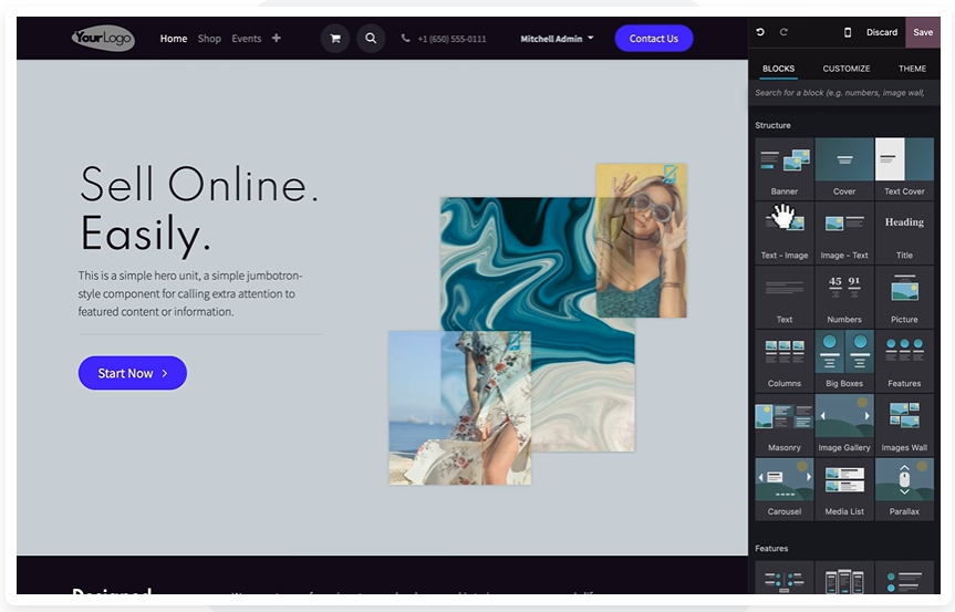 El editor visual de Odoo te permite arrastrar y soltar bloques para construir tu sitio a tu gusto. Puedes ajustar colores, fuentes, filtros e incluso agregar efectos visuales o animaciones en segundos. Todo lo que imaginas para una experiencia de usuario atractiva y moderna.