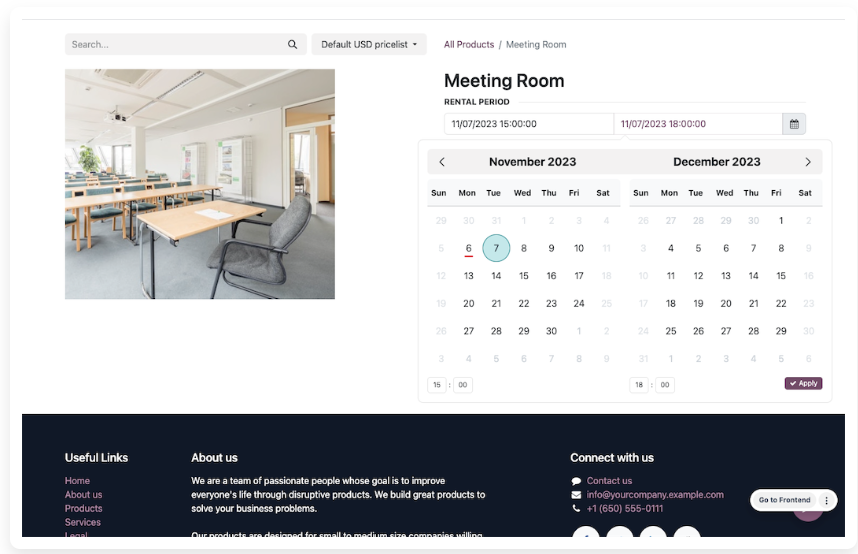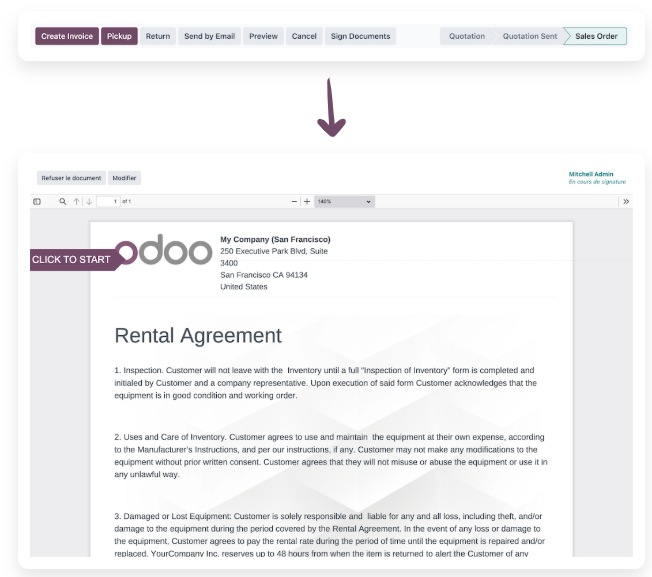La aplicación Alquiler de Odoo te permite gestionar con facilidad todo el ciclo de alquiler en una sola plataforma; productos, programa de recolecciones y firma documentos. Esto facilita que los negocios con productos alquilables (equipos, vehículos, mobiliario…) operen de forma ordenada y profesional.