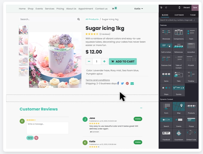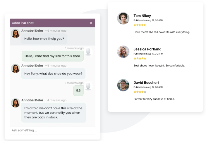 El comercio en línea también puede ser cercano. Odoo integra herramientas para chatear con tus clientes en tiempo real, resolver dudas y guiarlos durante su compra. Además, puedes aprovechar reseñas y valoraciones para fortalecer la confianza y la lealtad hacia tu marca.