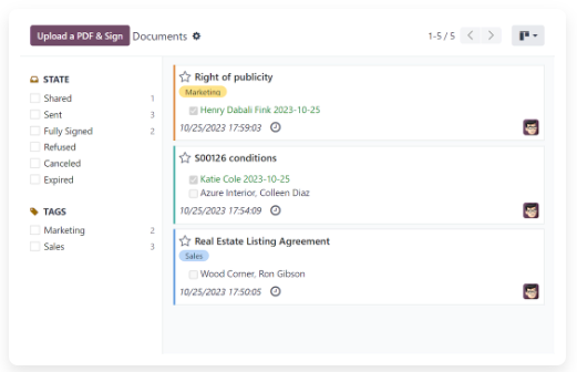 Firma Electrónica de Odoo ofrece la flexibilidad de recabar firmas en segundos, desde cualquier dispositivo y en cualquier momento. Tus clientes y colaboradores pueden revisar y firmar documentos con tan solo un par de clics, garantizando una experiencia fluida y moderna.