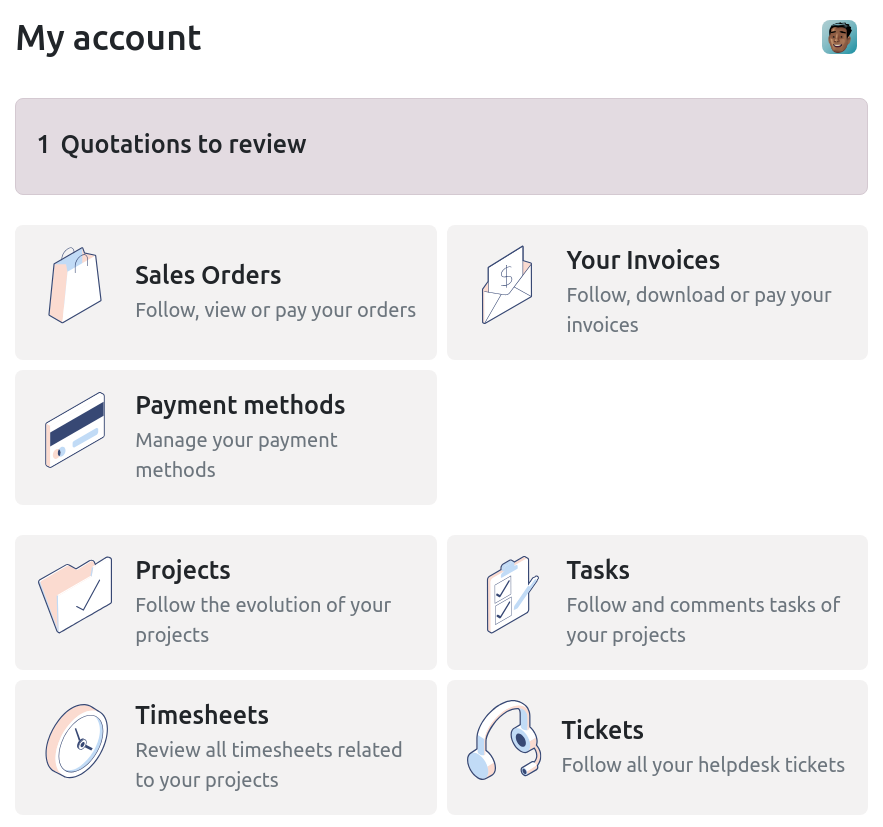 Tus clientes pueden acceder a sus documentos (cotizaciones, órdenes, entregas) directamente desde un portal dedicado. Además, Odoo integra pagos en línea y firmas electrónicas