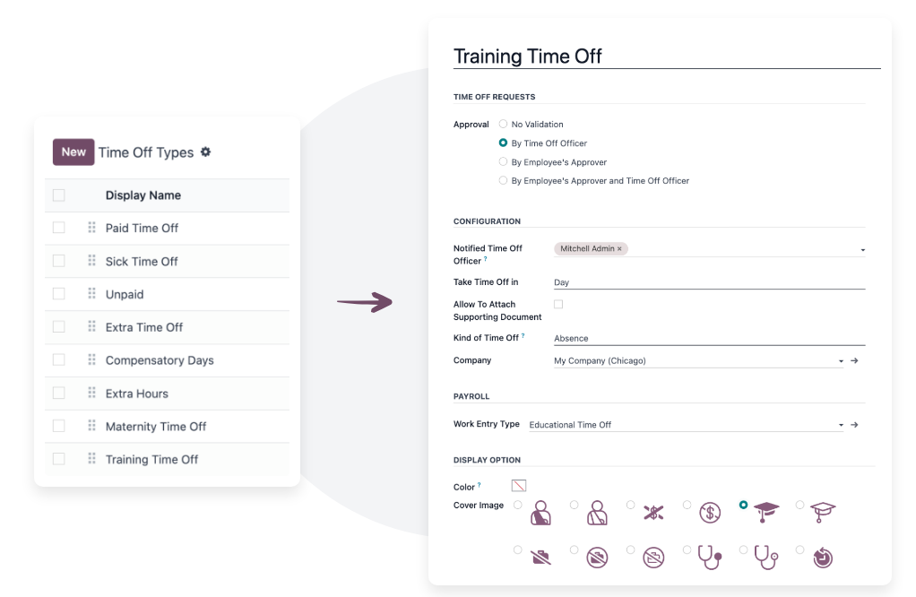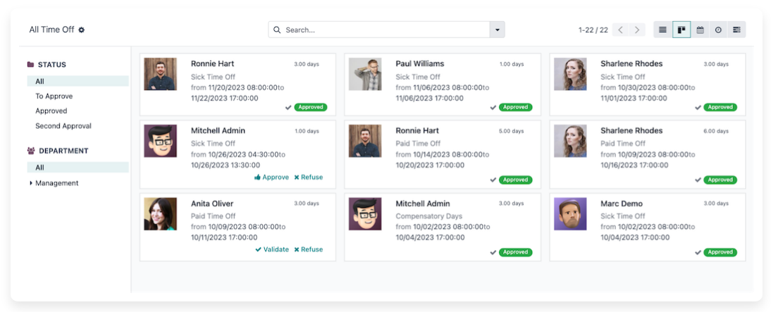 Cada empresa cuenta con políticas específicas en materia de permisos y ausencias. Odoo permite crear múltiples tipos de permisos (vacaciones, días personales, incapacidad, permisos especiales, entre otros) y definir reglas claras de aprobación y validación.