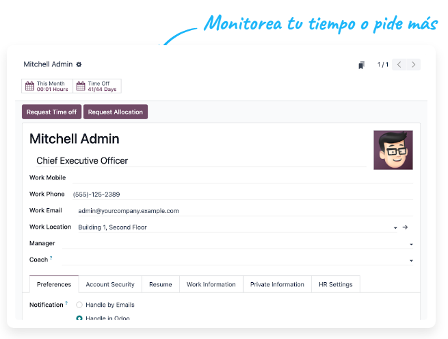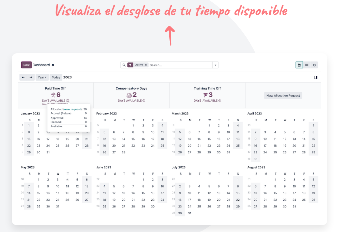 La aplicación Vacaciones de Odoo ofrece una solución integral para administrar solicitudes de tiempo libre de manera ágil, totalmente integrada con otros procesos clave de la organización. Actualiza en tiempo real los registros de horas trabajadas, asistencia, nómina y permisos, reduciendo la carga administrativa y mejorando la precisión operativa.